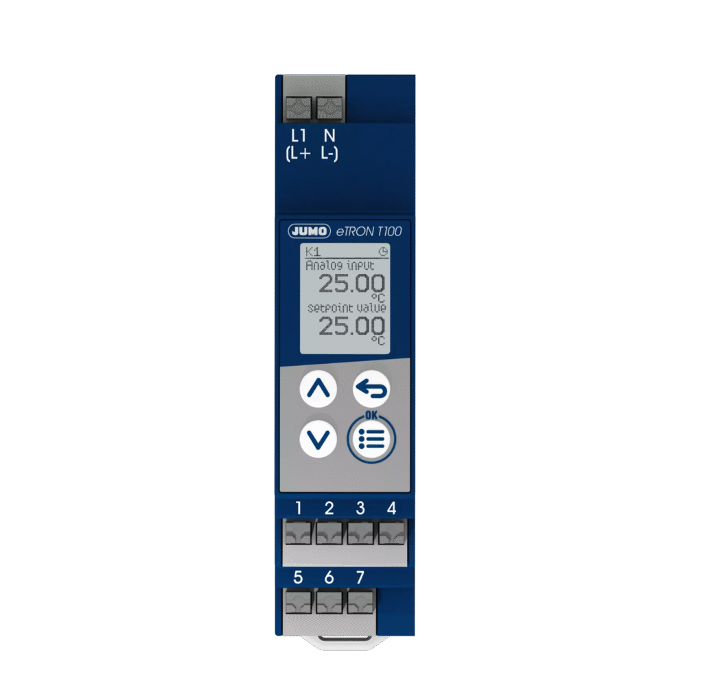 JUMO eTRON T100 on nykyaikainen elektroninen termostaatti, joka tarjoaa tarkan lämpötilan säädön ja valvonnan sekä valinnaisen PID two-state -säätötoiminnon.